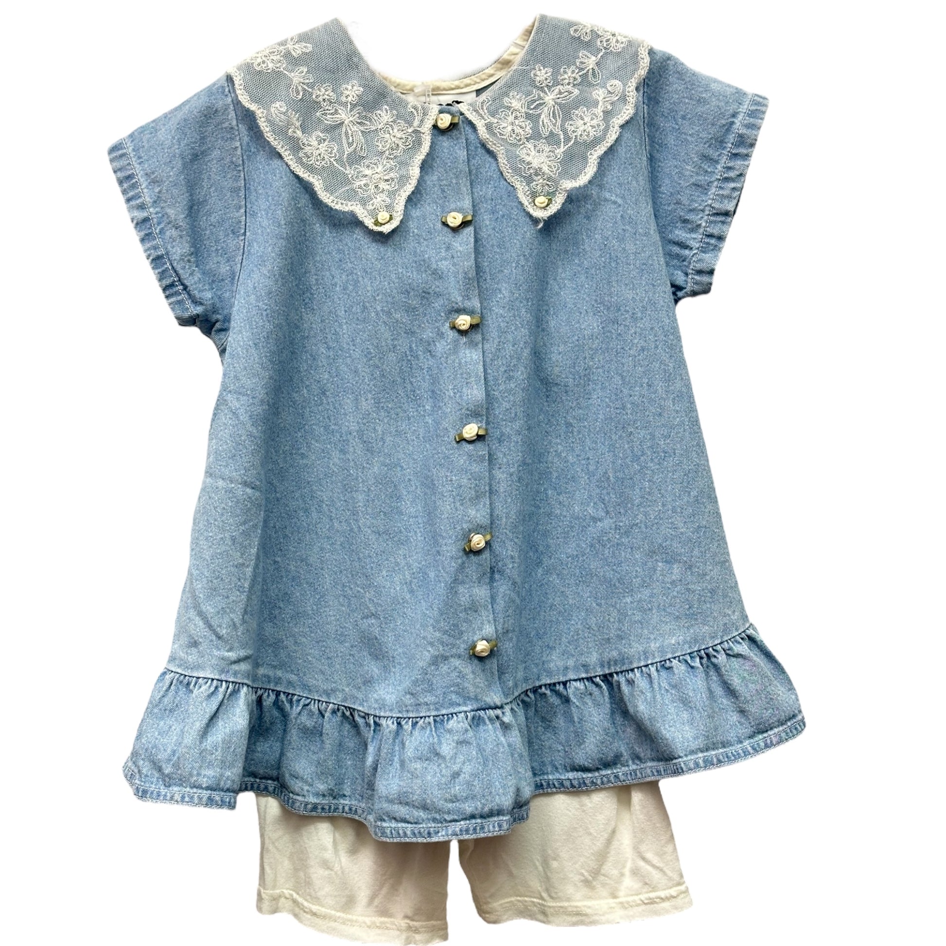 Lightweight denim tunic with lace collar and rosette snaps, cream bike shorts, matching bucket hat, made in the USA, Michelle Tanner vibes abound! (Pre-owned, vintage condition)