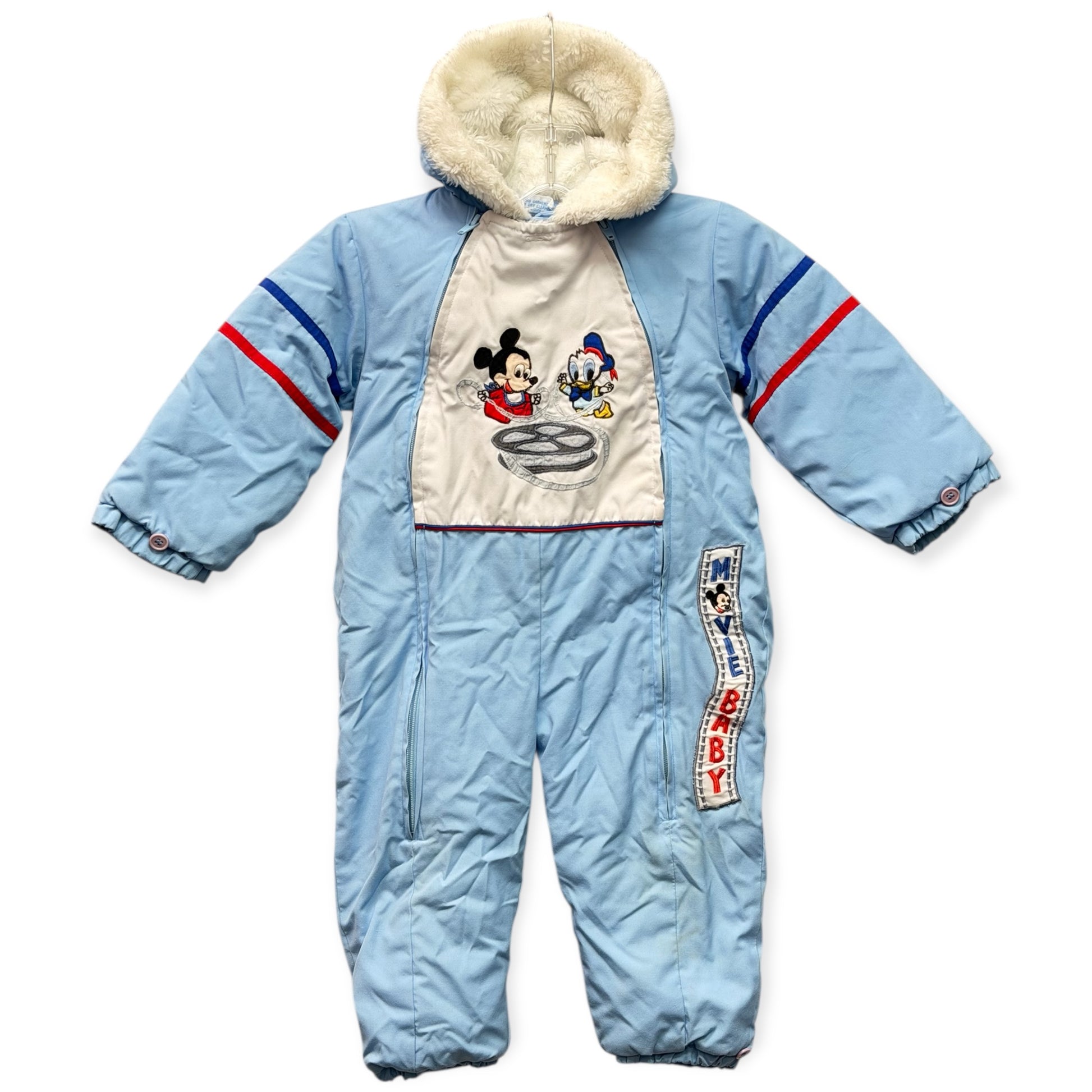 Double zip hooded bunting with Baby Mickey and Baby Donald, flannel lined, filmstrip theme. Light discoloration on knee, pictured (Pre-owned, vintage condition)