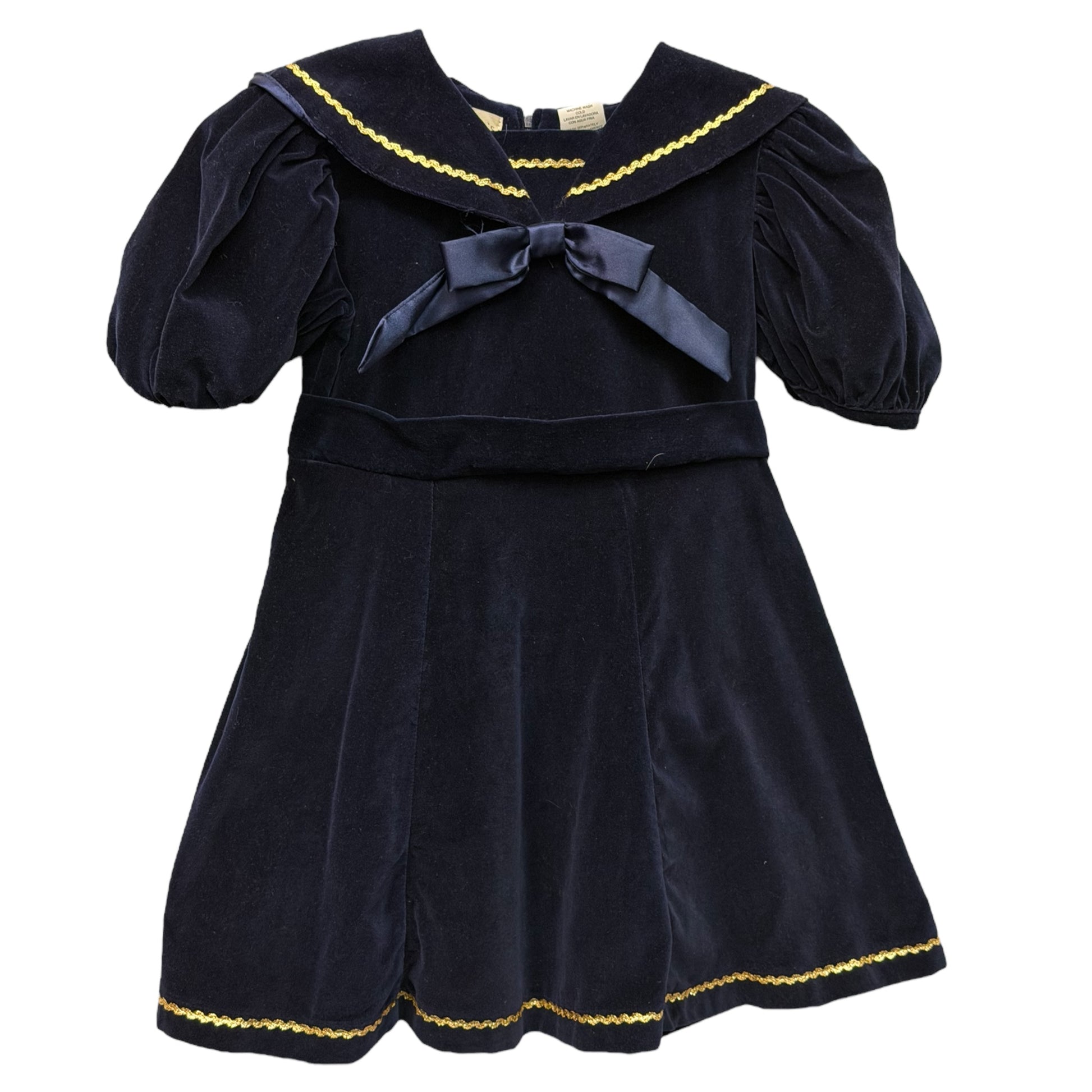 Navy velveteen with gold ric rac trim, satin bow, zip up back (Pre-owned, vintage condition)